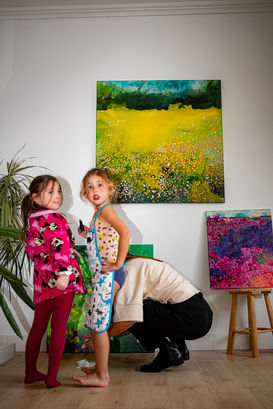 Haar atelier, gelegen in het hart van haar huis, is een constante bron van inspiratie. Terwijl ze haar dagelijkse bezigheden uitvoert, observeert ze haar werken en voegt ze nieuwe lagen toe wanneer de tijd het toelaat. Het atelier is niet alleen haar creatieve ruimte, maar ook een plek waar haar gezin samenkomt. Haar dochters werken er regelmatig zelf, elk op hun eigen manier. Zo is het atelier niet alleen het kloppende hart van het huis, maar ook van het gezin. Een plek waar creativiteit en samenzijn moeiteloos in elkaar overvloeien.